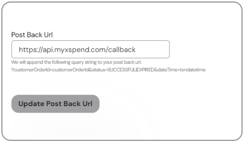 To receive transaction status updates via a postback request, merchants must configure their PostBack URL within the MyXspend portal. When a transaction reaches a terminal state, MyXspend will trigger an HTTP GET request to the specified PostBack URL, appending relevant query parameters.